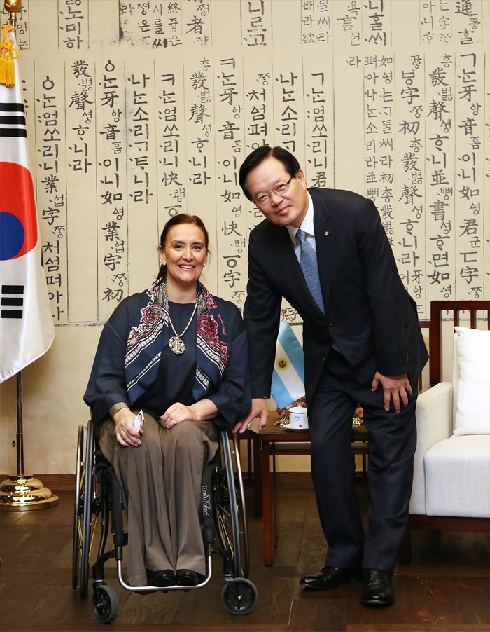 (서울=포커스뉴스) 정의화(오른쪽) 국회의장이 9일 오전 서울 여의도 국회 의장접견실에서 가브리엘라 미체띠(Gabriela MICHETTI) 아르헨티나 부통령 겸 상원의장을 접견, 기념촬영을 하고 있다. <사진제공=국회>