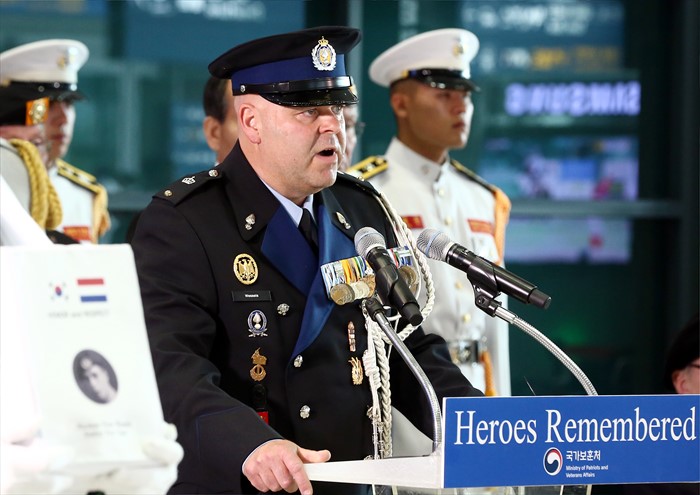 (서울=포커스뉴스) 부산 UN기념공원에 안장을 희망한 6.25전쟁 네덜란드 참전용사 故 니콜라스 프란스 웨셀(Nicolas Frans Wessels)씨의 아들 페트러스 코넬리스 웨셀(Petrus Cornelis Wessels)씨가 9일 오후 인천국제공항에서 열린 유해봉환식에서 인사말을 하고 있다 6·25전쟁에 네덜란드 반호이츠 부대원(일병)으로 참전한 故 니콜라스 프란스 웨셀씨는 1953년 11월에 한국을 떠났지만 자신이 목숨바쳐 지켰던 한국에 대한 애정이 아주 컸으며, 평소 부산 UN기념공원에 묻힌 전우들을 그리워하다 지난해 4월 7일 "한국에 있는 전우들 곁에 잠들게 해 달라"는 유언을 남긴 채 향년 84세의 일기로 삶을 마감했다. 지난해 5월 부산 UN기념공원에 프랑스 참전용사 故 레몽 베나르씨가 사후 안장 실시된 이후 4번째인 웨셀 씨는 오는 12일 오전 부산UN기념공원에 안장된다. <사진제공=국가보훈처>