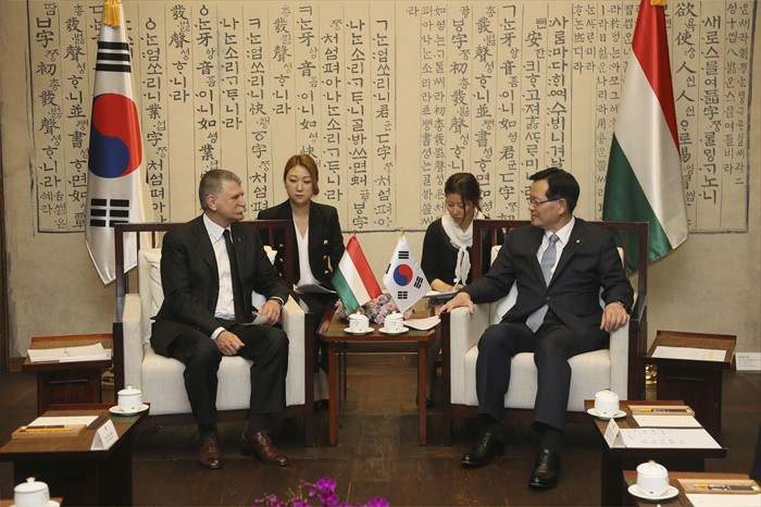 (서울=포커스뉴스) 정의화(오른쪽) 국회의장이 9일 오후 서울 여의도 국회 의장접견실에서 라슬로 꾀비르 헝가리 국회의장을 접견, 양국관계 발전과 상호 협력방안에 대해 논의하고 있다. <사진제공=국회>