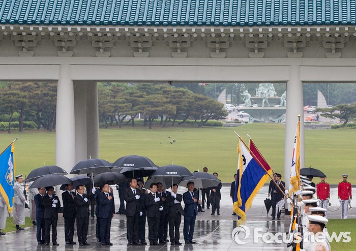 (서울=포커스뉴스) 10일 오전 서울 동작구 국립현충원을 찾은 정진석 새누리당 신임 원내대표와 김광림 신임 정책위의장이 국민의례를 하고 있다.