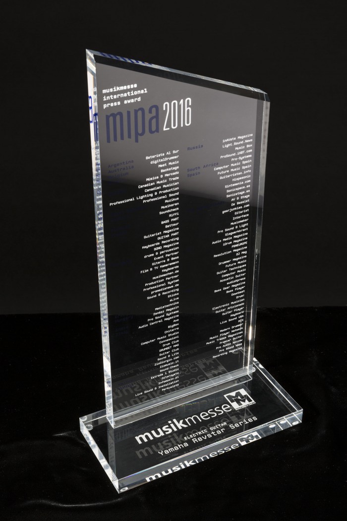 야마하뮤직코리아 관계자는 "세계적으로 인정 받는 시상식에 야마하 제품들이 월등한 성능과 디자인으로 우수한 평가를 받아 매우 기쁘다"며 "이번 수상을 발판 삼아 앞으로도 더욱 제품 개발 및 판매 역량을 넓혀가는 동시에 전문가뿐 아니라 고객이 불편함 없이 쉽게 사용하고 만족도를 높일 수 있도록 노력해 나가겠다"고 밝혔다.야마하 레브스타 시리즈가 MIPA에서 수상한 트로피.<사진제공=야마하뮤직코리아>