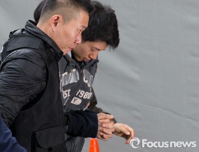 (인천=포커스뉴스) 안산 대부도 토막살인의 용의자 조성호(오른쪽)가 10일 오전 인천 연수구 연수동의 주거지에서 현장검증을 위해 범행현장으로 이동하고 있다.