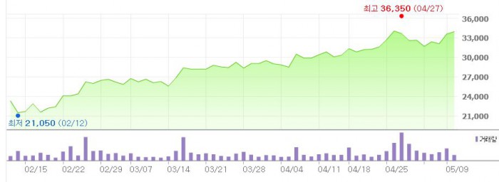 그는 "이 같은 실적 호조세는 국내 시장에서의 선전에 힘입었다"면서 "최근 콜라보레이션 제품 판매 호조와 매출 성장이 턴어라운드한 데 따라 목표가를 4만2000원으로 상향 조정했다"고 진단했다.최근 3개월간 에이블씨엔씨 주가 추이 <그래픽출처=네이버>
