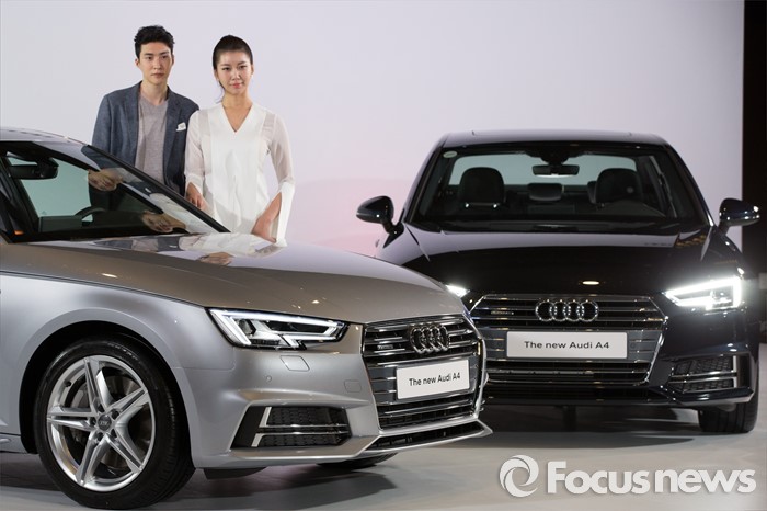 (서울=포커스뉴스) 10일 오전 서울 중구 반얀트리 클럽 앤 스파에서 모델들이 준중형 세단 '뉴 아우디 A4'를 선보이고 있다. '뉴 아우디 A4'는 기존 모델보다 무게가 최대 100kg까지 감량, 최고 출력 252마력, 최대 토크 38.0kg·m, 연비는 복합연비 기준 11.6km이다.