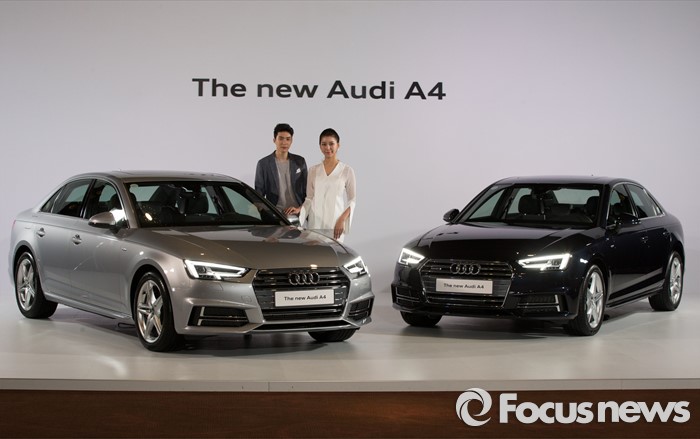 (서울=포커스뉴스) 10일 오전 서울 중구 반얀트리 클럽 앤 스파에서 모델들이 준중형 세단 '뉴 아우디 A4'를 선보이고 있다. '뉴 아우디 A4'는 기존 모델보다 무게가 최대 100kg까지 감량, 최고 출력 252마력, 최대 토크 38.0kg·m, 연비는 복합연비 기준 11.6km이다.