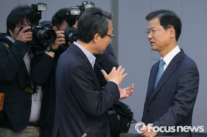 (서울=포커스뉴스) 천정배(오른쪽) 국민의당 공동대표와 김성식 정책위의장이 10일 오전 서울 여의도 국회 의원회관에서 열린 당선자 총회 및 3차 집중워크숍에 참석해 대화하고 있다.
