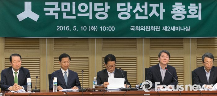 (서울=포커스뉴스) 안철수 국민의당 상임공동대표가 10일 오전 서울 여의도 국회 의원회관에서 열린 당선자 총회 및 3차 집중워크숍에 참석해 모두발언을 하고 있다. 왼쪽부터 박주선 최고위원, 천정배 공동대표, 박지원 원내대표, 안 대표, 김성식 정책위의장.