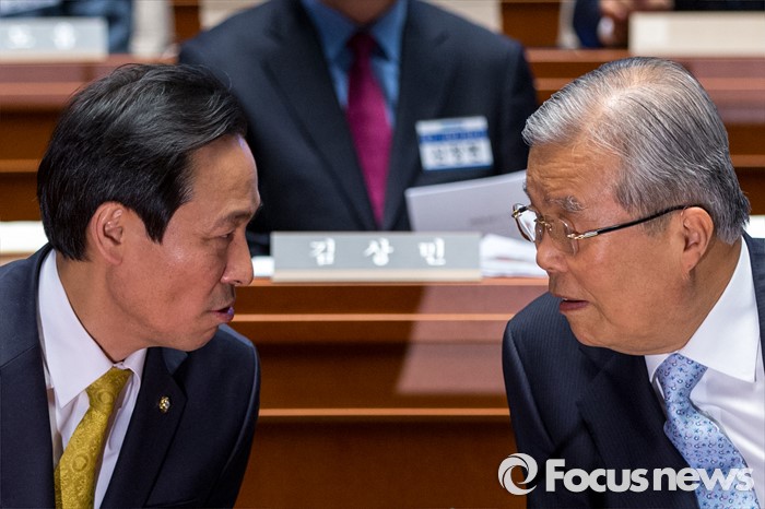 (서울=포커스뉴스) 김종인(오른쪽) 더불어민주당 비상대책 위원장과 우상호 원내대표가 10일 오전 서울 여의도 국회에서 열린 초선 당선자 워크숍에 참석해 대화를 나누고 있다.