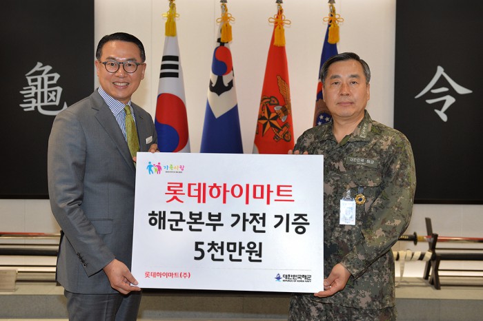 (서울=포커스뉴스) 롯데하이마트(이하 하이마트)는 10일 충남 계룡 해군본부에서 이동우 대표이사와 정호섭 해군참모총장이 참석한 가운데 해군 장병들을 위한 가전제품 전달식을 가졌다.