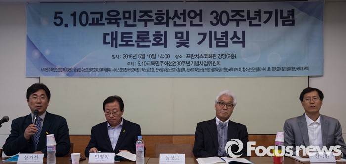 (서울=포커스뉴스) 10일 오후 서울 중구 프란치스코회관 강당에서 열린 '5.10 교육민주화선언 30주년기념 대토론회 및 기념식'에 참석한 성기선(왼쪽) 경기도 교육위원장이 토론회 시작을 알리고 있다. 왼쪽부터 성기선 경기도교육연구원장, 민병희 강원도 교육감, 심성보 한국교육연구네트워크 이사장, 김학한 참교육 연구소장.