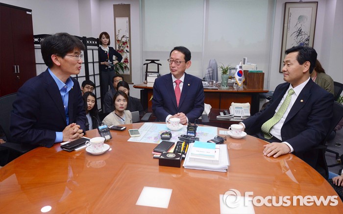 (서울=포커스뉴스) 김도읍(가운데) 새누리당 원내수석부대표, 박완주(왼쪽) 더불어민주당 원내수석부대표, 김관영 국민의당 원내수석부대표가 10일 오후 서울 여의도 국회 의원회관에서 박근혜 대통령과 여야 신임 원내지도부 회동 의제 조율을 위한 논의를 하고 있다.
