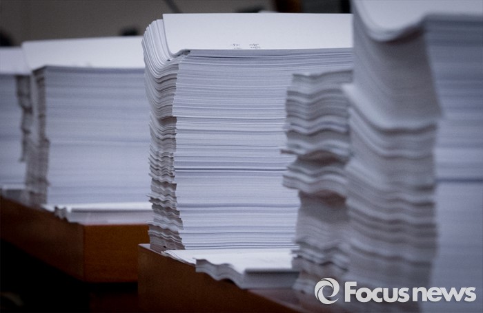 | △ 여당 자리 위 쌓인 법안 |