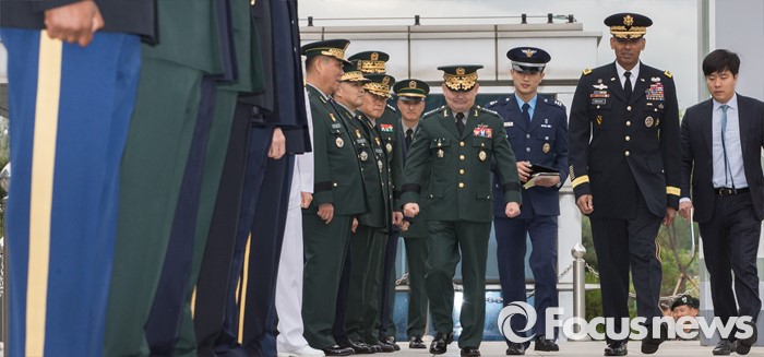 (서울=포커스뉴스) 10일 오후 서울 용산구 합동참모본부 대연병장에서 열린 환영 의장행사에서 빈센트 브룩스 신임 한·미연합사령관 겸 주한미군사령관과 이순진 합참의장이 의장대 사열을 마치고 이동하고 있다.