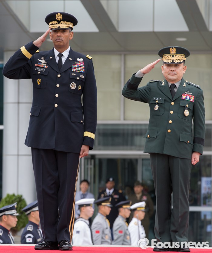 (서울=포커스뉴스) 10일 오후 서울 용산구 합동참모본부 대연병장에서 열린 환영 의장행사에서 빈센트 브룩스(왼쪽) 신임 한·미연합사령관 겸 주한미군사령관과 이순진 합참의장이 의장대 사열을 하고 있다.