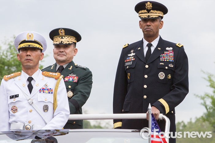 (서울=포커스뉴스) 10일 오후 서울 용산구 합동참모본부 대연병장에서 열린 환영 의장행사에서 빈센트 브룩스 신임 한·미연합사령관 겸 주한미군사령관과 이순진 합참의장이 의장대 사열을 하고 있다.