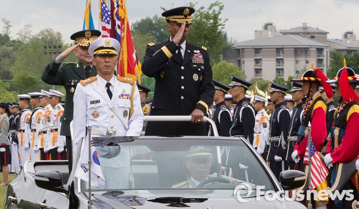 (서울=포커스뉴스) 10일 오후 서울 용산구 합동참모본부 대연병장에서 열린 환영 의장행사에서 빈센트 브룩스 신임 한·미연합사령관 겸 주한미군사령관과 이순진 합참의장이 의장대 사열을 하고 있다.