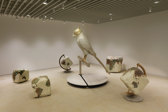 3층 전시장에는 앵무새 형상을 담은 설치작품 '말, 생각, 뜻'과 이를 둘러싼 '사각 지구본'이 전시되어 있어있다. 이번 전시의 아이콘이라고 할 수 있는 '말, 생각, 뜻'은 눈금이 새겨진 금속 잣대를 횃대 삼아 육중하게 올라앉은 앵무새다. 육중한 몸집 탓에 관객을 압도하지만 황금색 모자로 눈이 가려져 있어 애처롭게 보이기도 한다.
