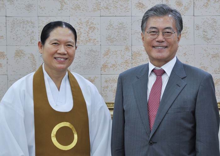 | △ 한은숙 원불교 교정원장과 포즈 취한 문재인 |