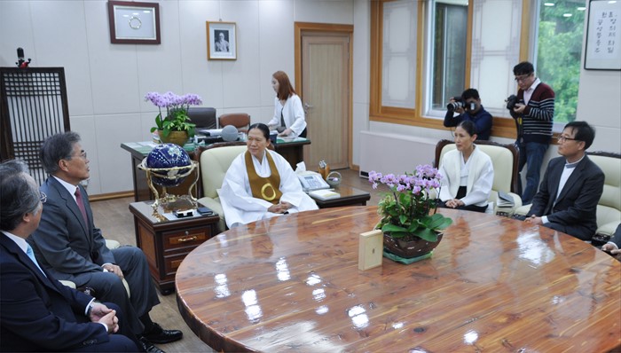 (서울=포커스뉴스) 문재인(왼쪽 두번째) 더불어민주당 전 대표가 10일 오후 전북 익산시 원불교 총부를 방문해 한은숙(왼쪽 세번째) 원불교 교정원장 등 관계자들과 면담을 하고 있다. <사진제공=원불교중앙총부>