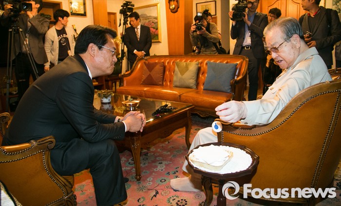 (서울=포커스뉴스) 정진석(왼쪽) 새누리당 원내대표가 10일 오후 서울 중구 김종필 전 총리 자택을 방문해 김 전 총리와 환담을 하고 있다.