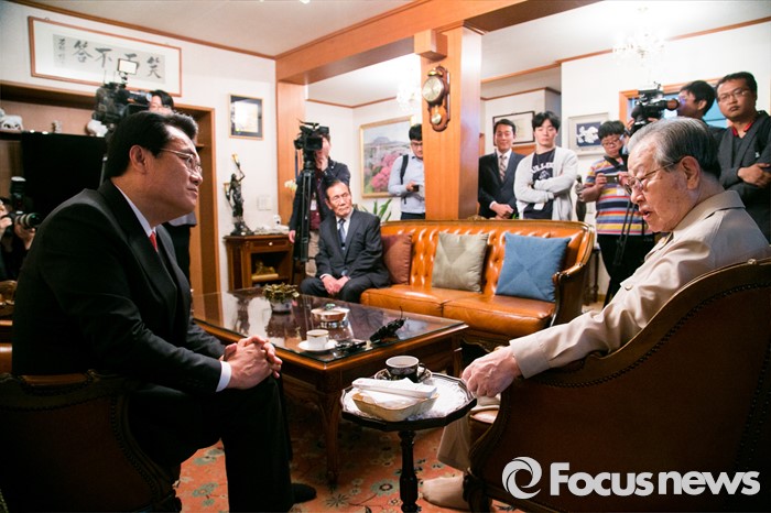 (서울=포커스뉴스) 정진석(왼쪽) 새누리당 원내대표가 10일 오후 서울 중구 김종필 전 총리 자택을 방문해 김 전 총리와 환담을 하고 있다.