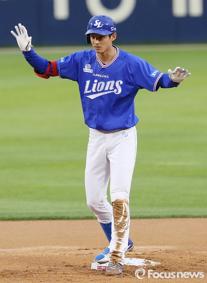 (서울=포커스뉴스) 10일 서울 잠실구장에서 열린 2016 프로야구 삼성-LG 경기 1회초 1사 2루에서 삼성 구자욱이 좌익수 왼쪽으로 빠지는 1타점 2루타를 치고 2루에 안착해 있다.