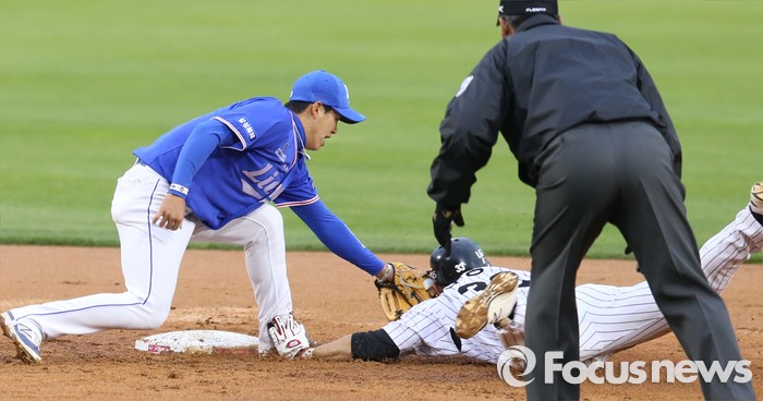 (서울=포커스뉴스) 10일 서울 잠실구장에서 열린 2016 프로야구 삼성-LG 경기 1회말 우전 안타로 진루한 LG 박용택이 정성훈 타석때 2루 도루를 시도하다 이웃되고 있다.
