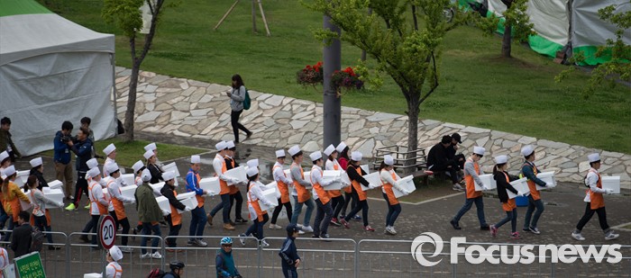 (서울=포커스뉴스) 10일 오후 서울 서초구 반포한강공원에서 열린 삼계탕 만찬에서 행사 관계자들이 중국 건강보조제품 회사 중마이과기발전유한공사 소속 임직원들이 먹을 삼계탕을 나르고 있다.