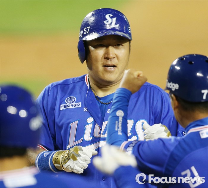 (서울=포커스뉴스) 10일 서울 잠실구장에서 열린 2016 프로야구 삼성-LG 경기 8회초 1사 1,2루에서 삼성 최형우가 우월 3점 홈런을 치고 선행주자의 환영을 받으며 홈인하고 있다.
