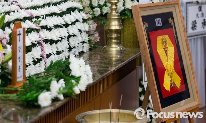 (서울=포커스뉴스) 10일 오후 서울 송파구 서울아산병원 장례식장에 마련된 故 강영훈 전 국무총리의 빈소에 국민훈장 무궁화장이 놓여 있다.