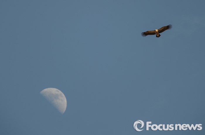 (바가 가즈링 촐로/몽골=포커스뉴스)바가 가즈링 촐로 상공에 수염수리가 반달을 배경으로 날고 있다.