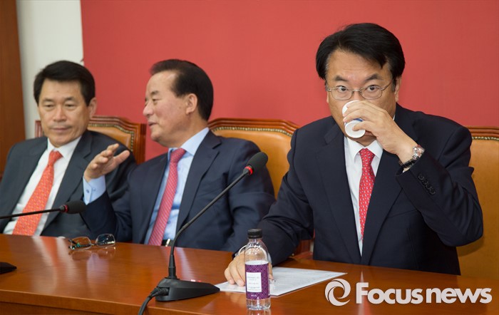 (서울=포커스뉴스) 정진석(오른쪽) 새누리당 원내대표가 중진 의원들과 함께 11일 오전 서울 여의도 국회에서 원내지도부-중진의원 연석회의에 참석해 물을 마시고 있다.