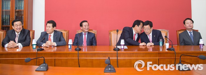 (서울=포커스뉴스) 정진석(오른쪽 세번째) 새누리당 원내대표와 김광림(오른쪽 두번째) 정책위의장이 11일 오전 서울 여의도 국회에서 원내지도부-중진의원 연석회의에 참석해 대화하고 있다.