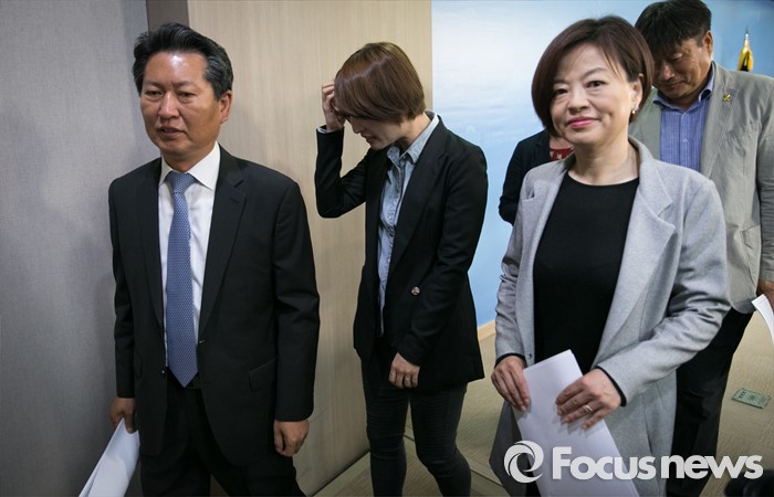 (서울=포커스뉴스) 정청래(왼쪽), 진선미(오른쪽) 더불어민주당 의원과 백남기 농민의 딸 도라지 씨가 11일 오전 서울 여의도 국회 정론관에서 백남기 농민 진압 책임자 처벌과 재발방지를 위한 국회 청문회 실시 촉구 기자회견을 마친 뒤 퇴장하고 있다.