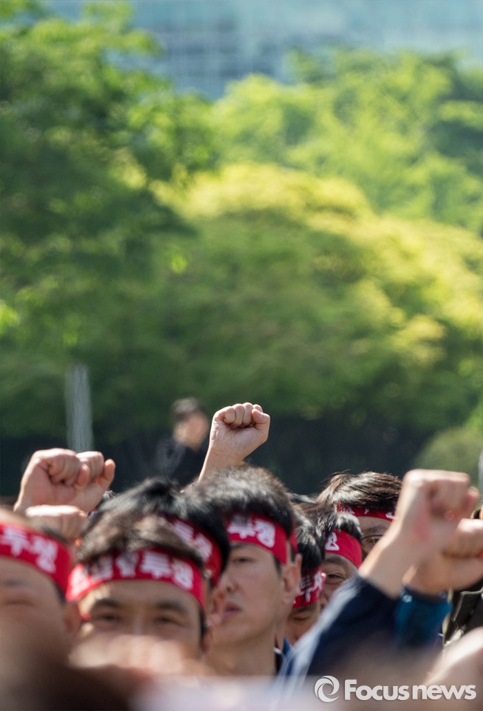 (서울=포커스뉴스) 11일 오전 서울 영등포구 여의도 국민은행 앞에서 양대노총 공공부문 공대위 주최로 열린 '성과연봉제ㆍ강제퇴출제 저지 천막농성' 돌입집회 참가자들이 구호를 외치고 있다.
