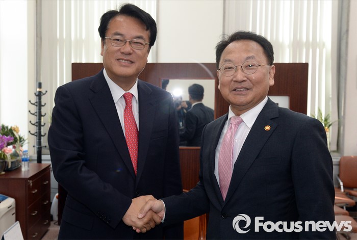 | △ 악수하는 정진석 원내대표-유일호 부총리 |