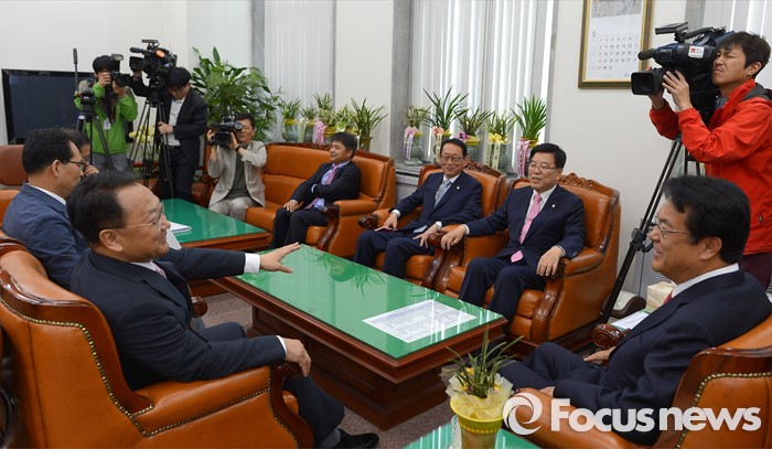 (서울=포커스뉴스) 정진석(오른쪽 첫번째) 새누리당 원내대표 등 원내지도부가 11일 오전 서울 여의도 국회를 방문한 유일호(왼쪽 두번째) 경제부총리 겸 기획재정부 장관과 면담을 하고 있다.