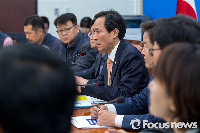 (서울=포커스뉴스) 우상호 더불어민주당 원내대표가 11일 오전 서울 여의도 국회에서 열린 전국금융산업노조 간담회에서 모두발언 하고 있다.