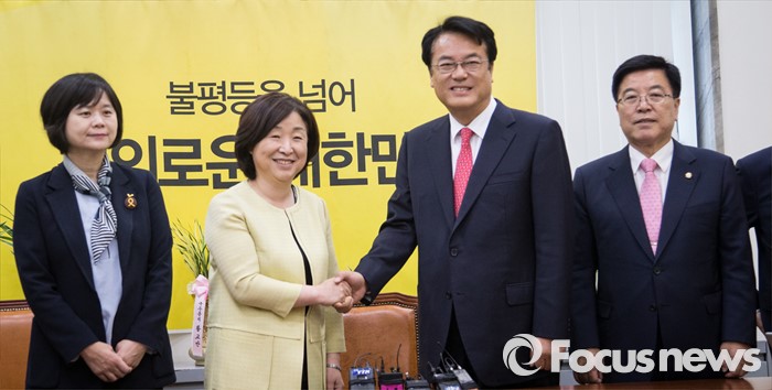 (서울=포커스뉴스) 정진석(오른쪽 두번째) 새누리당 원내대표와 김광림(오른쪽 첫번째) 정책위의장이 11일 오전 서울 여의도 국회에서 심상정 정의당 상임대표를 예방해 인사하고 있다.
