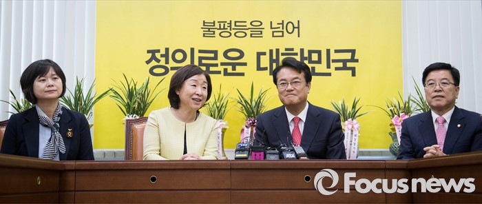 (서울=포커스뉴스) 정진석(오른쪽 두번째) 새누리당 원내대표와 김광림(오른쪽 첫번째) 정책위의장이 11일 오전 서울 여의도 국회에서 심상정(왼쪽 두번째) 정의당 상임대표를 예방해 대화하고 있다.
