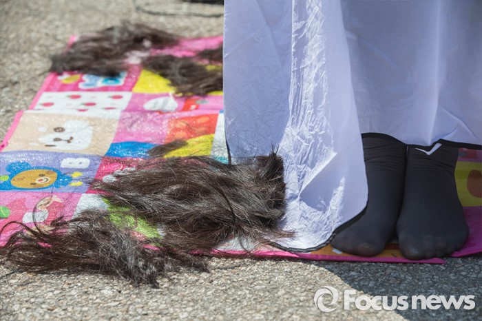 (서울=포커스뉴스) 11일 오전 서울 관악구 서울대학교 앞에서 사시존치를위한고시생모임 회원 황지나씨가 교육부의 전수조사 결과 발표를 규탄하며 삭발식을 하고 있다.