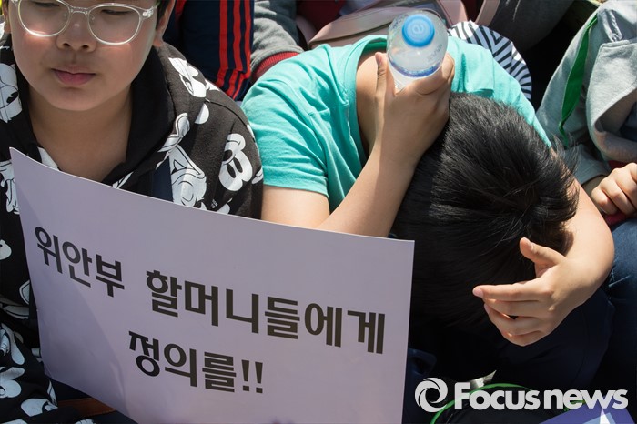 (서울=포커스뉴스) 11일 오후 서울 종로구 옛 주한일본대사관 앞에서 한국정신대문제대책협의회와 학생들이 '일본군 위안부 문제해결을 위한 정기 수요시위'를 하고 있다.