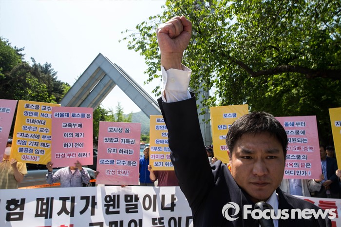 (서울=포커스뉴스) 11일 오전 서울 관악구 서울대학교 앞에서 사시존치를위한고시생모임 회원들이 교육부의 전수조사 결과 발표를 규탄하며 시위를 하고 있다.