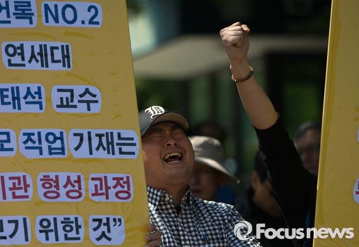 (서울=포커스뉴스) 11일 오전 서울 관악구 서울대학교 앞에서 사시존치를위한고시생모임 회원들이 교육부의 전수조사 결과 발표를 규탄하며 시위를 하고 있다.
