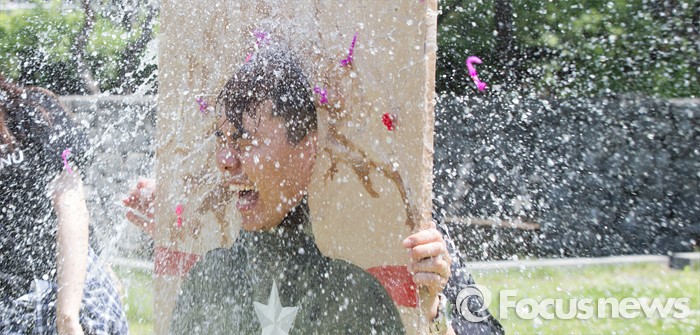 (대전=포커스뉴스) 대학축제가 한창인 11일 오전 대전 대덕구 한남대학교에서 학생들이 물풍선을 맞고 있다.