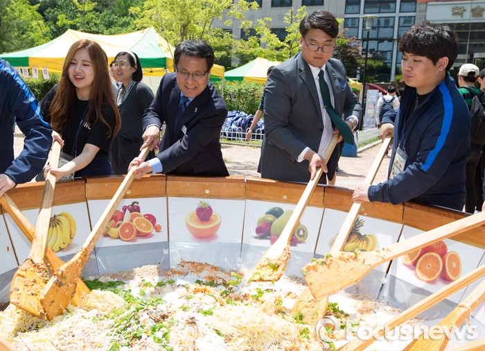 (대전=포커스뉴스) 11일 오전 대전 대덕구 한남대학교에서 이덕훈 총장과 학생들이 개교 60주년 기념 대형 비빔밥을 학생들에게 나눠주는 행사를 갖고 있다.