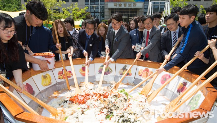(대전=포커스뉴스) 11일 오전 대전 대덕구 한남대학교에서 이덕훈 총장과 학생들이 개교 60주년 기념 대형 비빔밥을 학생들에게 나눠주는 행사를 갖고 있다.