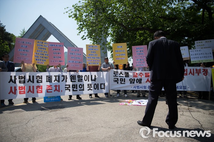 사법시험존치를위한고시생모임과 사시존치국민연대 등 회원 50여명은 11일 오전 10시30분 서울 관악구 서울대학교 정문 앞에서 집회를 열고 "로스쿨 교수들이 특권을 유지하려 국민을 희생양으로 만들고 있다"며 로스쿨 제도를 비판했다.