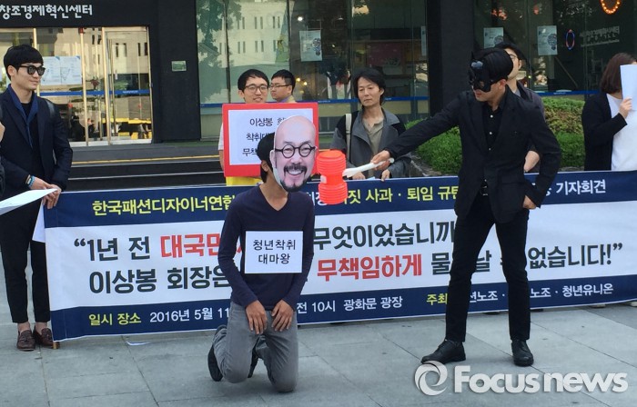 패션노조·청년유니온·알바노조 등 3개 단체는 11일 오전 서울 종로구 서울창조경제혁신센터 앞에서 기자회견을 열고 패션디자인업계 열정페이 문제를 해결하지 않고 임기를 마친 이 전 회장을 규탄했다.
