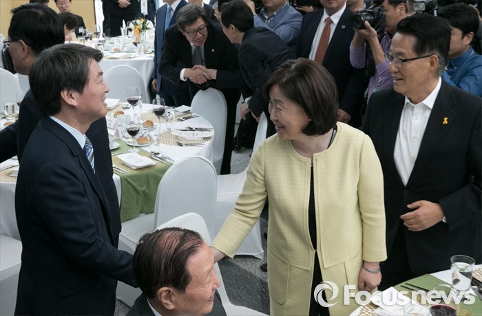 (서울=포커스뉴스) 11일 오후 서울 여의도 국회 의원회관에서 열린 20대 국회 초선의원 의정연찬회 오찬에 참석한 안철수(왼쪽) 국민의당 상임공동대표와 심상정(가운데) 정의당 상임대표가 인사하고 있다.